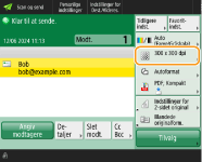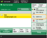 <Orig. indhold Retning> vælg <Øverst ved fjern kant> eller <Øverst ved kant> alt efter retningen af originalen tryk på <OK>.Angivelse af flere modtagere, inklusive faxerIndstiller du <Aktivér fax i scannings- og sendefunktion> til <Til>, kan du angive faxmodtagere fra skærmbilledet Grundlæggende scanningsfunktioner (<Vis faxfunktion>). Denne indstilling er praktisk til angivelse af flere modtagere inklusive faxer, som f.eks. når du gemmer en kopi af en sendt fax på en filserver.