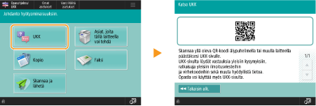 Kun <UKK> valitaan, näkyviin tulee QR-koodi. Voit sitten näyttää laitteen UKK-sivun skannaamalla tämän QR-koodin mobiililaitteella, kuten matkapuhelimella tai tabletilla.