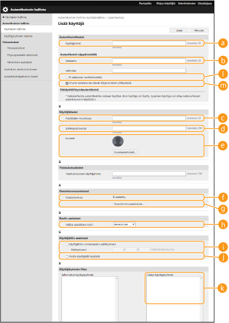 Jos tämä kohta ohitetaan tuotaessa muutoksia, olemassa olevan käyttäjän alkuperäinen salasana säilyy.