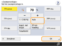 Indien u <Auto> instelt, dient u handmatig een papierformaat te selecteren. Als u geen papierformaat selecteert, dan wordt het zoompercentage automatisch ingesteld op het formaat van het papier dat zich in papierlade 1 bevindt.