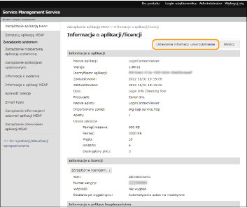 Wyświetla lub usuwa informacje związane z ustawieniami aplikacji MEAP. Jeśli istnieje informacja o ustawieniach współdzielonych między aplikacjami, wyświetla się [Informacje o współdzielonych ustawieniach aplikacji]. Może zostać wybrane tak, jak pozostałe elementy.
