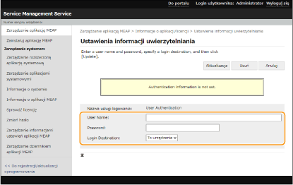 Jeśli aplikacja logowania zostanie zmieniona, potwórz ponownie informacje uwierzytelniania w [Ustaw uwierzytelnianie MEAP]. Konieczne może być ponowne wpisanie informacji uwierzytelniających.