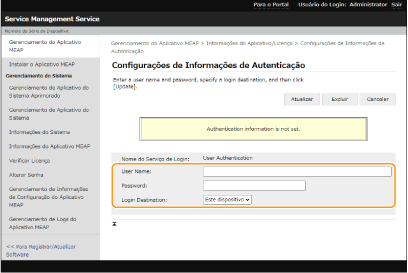 Se a aplicação de início de sessão for alterada, reconfirme as informações de autenticação em [Programar autenticação MEAP]. Poderá ser necessário reintroduzir as informações de autenticação.