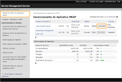 Se desinstalar uma aplicação MEAP, poderá ter de reiniciar a máquina. Siga as instruções apresentadas no ecrã para reiniciar a máquina.