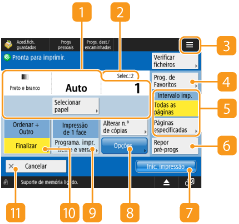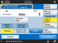 Apresenta o estado das programações como o formato do papel onde pretende imprimir e o número de impressões. Não se esqueça de confirmar as programações para uma impressão correta. Para alterar as programações, carregue no botão sob a secção de apresentação. Para alterar o número de impressões, introduza o número pretendido utilizando as teclas numéricas.