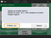 Когда для параметра <Отображать уведомление о приеме задания> задано значение <Вкл.>, экран <Монитор сост.> может появиться на следующем экране, который отображается после получения отправленного задания. <Отображать уведомление о приеме задания>