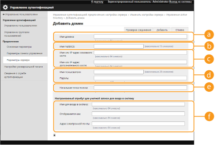 Выберите способ задания имени домена местоположения для входа. Чтобы указать имя домена вручную, установите переключатель [Укажите имя домена] и введите имя домена. Чтобы указать поле данных LDAP (имя атрибута), из которого следует получить имя домена на сервере LDAP, установите переключатель [Укажите имя атрибута для получения имени домена] и введите имя атрибута (Пример: dc).