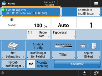 Visar inställningsstatus för exempelvis reproförhållande, pappersformat och antal kopior. Kom ihåg att bekräfta inställningarna för att kunna kopiera. För att ändra inställningarna, tryck på knappen under skärmbildsdelen.
