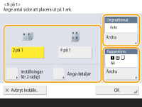Genom att trycka på <Ändra> i <Originalformat> kan du välja originalets format, och genom att trycka på <Ändra> i <Pappersformat> kan du välja pappersformat.