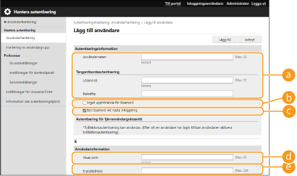 En användare med ”Administrator” som användarnamn registreras som standard med administratörsbehörigheter. Användaren ”Administrator” kan inte raderas men kan avaktiveras efter att ha lagt till en ny användare med behörigheter som ”Administrator”. Om användaren ”Administrator” är inaktiverad kan du inte ändra inställningar som bara användaren ”Administrator” kan konfigurera på maskinens kontrollpanel.