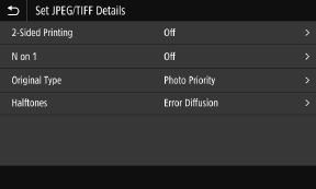 To display the screen, press [Set JPEG/TIFF Details] on the Memory Media Print settings screen.