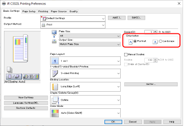 2 | On the [Basic Settings] screen of the driver, set [Orientation] to the same orientation you set in step 1. ![]() |