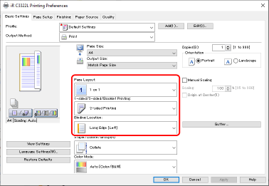 3 | While checking the print preview, set [Page Layout] [Page Order] [1-sided/2-sided/Booklet Printing] [Binding Location].![]() |