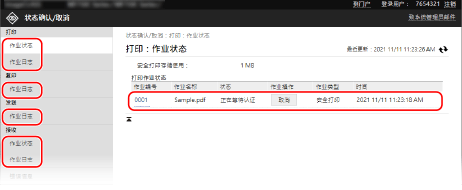 这将显示所有打印作业的状态,而不管部门 ID 管理设置如何。