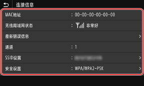 使用 [状态确认] 查看信息还可以使用以下步骤查看无线局域网状态和错误信息: 在操作面板的 [主页] 或其他位置  [状态确认]  [网络信息]  [网络连接类型]。 |