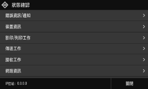 在 [首頁] 畫面和其他位置按下 [狀態確認] 時會顯示此畫面。