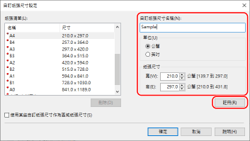 輸入自訂尺寸紙張名稱和紙張尺寸,然後按一下 [註冊]。
