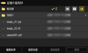 若要選擇所有顯示的檔案,請按下畫面底部的 [選擇全部]。如果同時存在 PDF 檔案和影像檔案(JPEG 或 TIFF 檔案),則會顯示選擇檔案類型的畫面。使用該畫面選擇要列印的檔案類型。