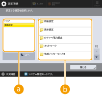 現在表示しているメニュー階層に属する設定項目が一覧表示されます。