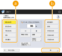 原稿と同じサイズの用紙に等倍でコピーすると、原稿の端に配置されている画像がわずかに欠けてしまう場合があります。<倍率>  <少し小さめ(全面コピー)>を押すと、少しだけ縮小してコピーされるので画像の欠けを防ぐことができます。 <少し小さめ(全面コピー)>を設定すると、自動的に<移動>が<センター>に設定されます。 OHPフィルムのように透明度の高い原稿は自動的に倍率を設定できません。定形変倍またはズーム変倍で読み込みしてください。 |