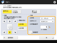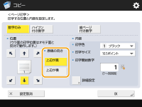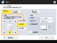 部数印字はコピーしたすべてのページに印字されます。 部数印字と一緒に日付や文字列を印字することもできます。<部数印字拡張の設定> <ページ印字>と<スタンプ>の文字列は<ページ印字/スタンプの文字列登録>に登録されている文字列から選ぶこともできます。 <ページ印字>、<スタンプ>、<日付印字>、<部数印字>のいずれかで、同じ印字位置を指定しているときは、 (スタート)を押すと、そのままの設定でプリントするかを確認する画面が表示されます。<部数印字拡張>を<ON>に設定しているときは、以下のように設定できる内容が変わります。<部数印字拡張の設定> 部数印字の印字位置で<全面に印字>、<5箇所に印字>を選択することができなくなります。 部数印字の印字サイズが、<10.5ポイント>、<12.0ポイント>、<14.0ポイント>となります。 |