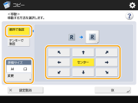 移動先の設定について 原稿の向きと置く場所によって、画像を移動する方向が変わります。 原稿台に置いた場合 上辺が横:画像を右および下に移動します。 上辺が奥:画像を左および下に移動します。 フィーダーに置いた場合 上辺が横:画像を下、左および右に移動します。 上辺が奥:画像を上、下および右に移動します。 <場所で指定>は、画像が欠けないように調整されます。 <テンキーで指定>は、画像が欠ける場合があります。 |