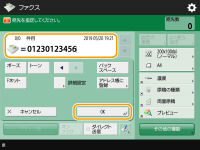 指定した宛先の総数を確認するには画面右上に、指定した宛先の総数が表示されます。送信前に宛先の数に誤りがないか確認することができます。 ![]() 発信元の情報を付けて送信するには発信元の名前やファクス番号などを付けて送信することができます。<発信元記録> 送信状況を確認するには<状況確認>画面で送信状況を確認できます。状況を確認したうえで、もう一度送信しなおしたり、送信を中止したりすることができます。送受信状況や履歴を確認する <ジョブ受付時の確認表示>が<ON>に設定されている場合は、送信ジョブが受け付けられたあとに表示される以下の画面から、<状況確認>画面を表示させることができます。<ジョブ受付時の確認表示> ![]() 相手機が使用中などで送信できなかったときは一定時間経過すると自動的にリダイヤルされます。リダイヤルの間隔や回数などは変更することができます。<自動リダイヤルの設定> 送信結果のレポートをプリントするにはファクスの基本画面で<その他の機能> <送信結果レポート>を押すと、送信結果が記載されたレポートが自動的にプリントされるように設定できます。<その他の機能>からジョブごとに設定するためには、<送信結果レポート>で<エラー時のみ>または<OFF>を選択し、<「その他の機能」 でのプリントを許可>を<ON>にする必要があります。 原稿が重ねて読み込まれたときは読み込みが中断され、画面にメッセージが表示されます。メッセージに従ってジャム処理を行ってください。ジャム処理終了後、再開画面が表示されます。誤って重送検知と認識された場合は、<重送検知しない>を押して読み込みを再開してください。 あらかじめ重送検知を通知しないように設定するには、次の操作を行ってください。 送信時ごとにファクスの基本画面で<その他の機能> <フィーダー重送検知>を押して設定を解除する。<フィーダー重送検知のデフォルト設定>を<OFF>に設定する。<フィーダー重送検知のデフォルト設定> 送信画像の写真が黒くつぶれてしまうときや、カラー原稿の下地の薄い色を除去できないときは以下の条件/設定を満たす場合は、送信画像の品位を改善できることがあります。 ジョブ種別: ファクス(メモリー送信)またはスキャンして送信(ファクス/Iファクス) <カラー選択>: <白黒2値>(スキャンして送信時) <原稿の種類>: <文字> <濃度> <背景調整>: <自動><解像度>: 200 dpi x 400 dpi 、300 dpi x 300 dpi*、400 dpi x 400 dpi 、600 dpi x 600 dpi* *はスキャンして送信で設定可能 <白黒読込時の速度/画質優先> ファクス/I ファクス送信時:< 画質優先>(<白黒読込時の速度/画質優先>)複数の電話回線が設定されているときは<その他の機能> <回線選択>を押して、ファクス送信に使用する電話回線を選ぶことができます。回線の設定方法については、ファクスの設定をするを参照してください |