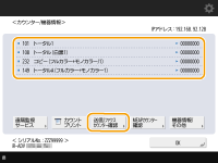 カウントしたページ数をMEAPアプリケーションごとに確認することもできます。手順2の画面で<MEAPカウンター確認>を押します。また、同じ画面で<機器情報/その他>  <デバイス構成確認>を押すと、本機に装着されているオプションや、ストレージ内のデータの暗号化に関わるセキュリティーチップのバージョンを確認することができます。