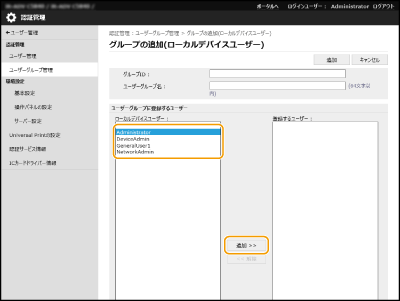 [ユーザー管理]  [認証管理]  [ユーザーグループ管理]をクリックする