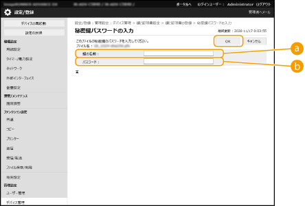 リモートUIから鍵と証明書(サーバー証明書)を登録します。本機に登録可能な鍵と証明書については、システム仕様を参照してください。