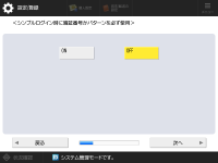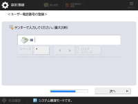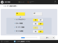 本機のセキュリティーを高めるために、ユーザー認証を使用する体制で運用してください。 ![]() ![]() <ユーザー認証を使用>の<ON>を押して使用するログイン方法の<ON>を押し、<次へ>を押します。 ユーザー認証を使用しない場合は、<ユーザー認証を使用>の<OFF>を押したあと<OK>を押し、Step 5へ進みます。 ![]() 本機に「Administrator」ユーザー以外に管理者が登録されていない場合は、次の設定を行います。 ![]() 本機のセキュリティーを高めるため、新規に管理者を登録して「Administrator」ユーザーを無効にする場合は、<はい>を押します。<管理者ユーザーの登録>で<ユーザー名>、<パスワード>を押してそれぞれ入力し、<OK>を押します。必要に応じて<Eメールアドレス>、<部門ID>、<表示名>を設定してください。詳しくは、ローカルデバイスにユーザー情報を登録するを参照してください。「Administrator」ユーザーは次回ログイン時から無効になります。 「Administrator」ユーザーで運用する場合は、<いいえ>を押します。 ![]() ![]() ログイン画面を表示するタイミングを選びます。<機能選択時に表示>を選んだ場合は、<ファンクション>を押して、ログイン画面を表示させる機能を選び、<OK>を押します。また、<設定/登録>画面でどの項目を設定するときにログイン画面を表示させるかを選びます。 <シンプルログイン>と<キーボード認証>を<OFF>にした場合は、<OK>を押します。Step 5へ進みます。 <シンプルログイン>または<キーボード認証>を<ON>にした場合は、<次へ>を押します。 ![]() ![]() ログイン画面でテンキー入力のみによる認証を使用する場合は、<ON>を押します。 <シンプルログイン>を<OFF>にした場合は、<OK>を押します。Step 5へ進みます。 <シンプルログイン>を<ON>にした場合は、<次へ>を押します。 ![]() ![]() シンプルログインで暗証番号やパターンの入力を必須にするかどうかを設定し、<次へ>を押します。 ![]() ![]() プリント機能に適した状態でシンプルログインを使用したい場合は、<ON>を押します。強制留め置き印刷が有効になり、パソコンからの印刷データを利用してユーザー登録したり、プリントするユーザーに適したログイン画面をデフォルト表示にしたりする設定になります。詳しくは、強制留め置き印刷の設定をする、<ユーザーの登録方法>、<シンプルログイン画面のデフォルト表示の変更>を参照してください。 ![]() ![]() シンプルログイン画面のプリセットボタン数を選び、<OK>を押します。 本機はログインサービスにUser Authentication(個人認証管理)を使用する設定になっています。詳しくは、個人認証管理を開始するを参照してください。 | |