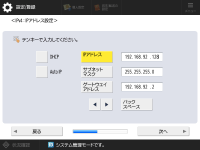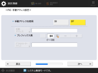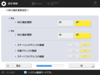 ネットワークに接続するための設定をします。 ![]() ![]() <IPv4を使用>または<IPv6を使用>の<ON>を押し、<次へ>を押します。IPv4/IPv6両方を使用することもできます。 <IPv4を使用>と<IPv6を使用>を<OFF>にして<OK>を押すと、ネットワークの設定を行わずにStep 9へ進みます。 ![]() <IPv4を使用>を<ON>にした場合は、次の設定を行います。 ![]() IPアドレスを自動で取得する場合は、<DHCP>または<Auto IP>を押し、<次へ>または<OK>を押します。 IPアドレスを手動で設定する場合は、<DHCP>または<Auto IP>の選択を解除して、<IPアドレス>、<サブネットマスク>、<ゲートウェイアドレス>を押してそれぞれ入力し、<次へ>または<OK>を押します。 IPv4アドレスの設定について詳しくは、IPv4アドレスを設定するを参照してください。 ![]() <IPv6を使用>を<ON>にした場合は、次の設定を行います。 ![]() ステートレスアドレスを使用する場合は<ON>/使用しない場合は<OFF>を押し、<次へ>を押します。 IPv6アドレスの設定について詳しくは、IPv6アドレスを設定するを参照してください。 ![]() ステートレスアドレスを設定したあと、次の設定を行います。 ![]() 手動アドレスを使用する場合は<ON>/使用しない場合は<OFF>を押し、<次へ>を押します。 手動アドレスを使用する場合は、<手動アドレス>、<プレフィックス長>、<デフォルトルーターアドレス>を押してそれぞれ入力します。 ![]() 手動アドレスを設定したあと、次の設定を行います。 ![]() DHCPv6を使用する場合は<ON>/使用しない場合は<OFF>を押し、<OK>を押します。 | |