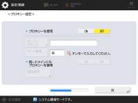 プロキシーを使用する場合に必要な設定をします。 ![]() ![]() プロキシーを使用する場合は<ON>を押し、<サーバーアドレス>、<ポート番号>を押してそれぞれ入力し、<OK>を押します。 <同一ドメインにもプロキシーを使用>を<ON>にした場合は、<認証設定>を押してプロキシー認証の設定をします。 プロキシーの設定について詳しくは、プロキシーを設定するを参照してください。 | |