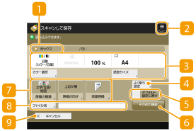 ホームの<スキャンして保存>を押したあと、<ボックス>、<アドバンスドボックス>、<ネットワーク>、<メモリーメディア>のいずれかを押して原稿を読み込もうとすると、次の設定画面が表示されます。
