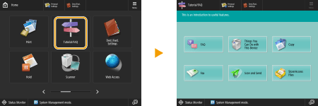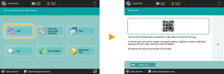 Press <Tutorial/FAQ> to display a screen that introduces what you can do with the functions of the machine as well as tips for using copy, scan, etc. View this screen when you want to learn more about what functions are available and how to use them. You can also access the FAQ page from a mobile device.