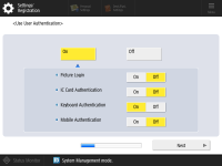 To enhance the security of the machine, use the machine under a system that uses user authentication. ![]() This machine is set to use the user authentication as the login service. For more information, see Configuring the Personal Authentication Management Settings. ![]() Press <On> for <Use User Authentication>, press <On> for the login method to use, and press <Next>. If you do not use user authentication, press <Off> for <Use User Authentication>, press <OK>, and proceed to Step 5. ![]() Specify the following settings if there are no administrators besides the "Administrator" user registered in the machine. ![]() To enhance the security of the machine by disabling the "Administrator" user and registering a new administrator, press <Yes>. In <Register Administrator>, enter <User Name> and <Password>, and press <OK>. Specify <E-Mail Address>, <Department ID>, and <Display Name> as necessary. For more information, see Registering User Information in the Local Device. The "Administrator" user will be disabled the next time you log in. To operate as "Administrator," press <No>. ![]() ![]() Select the timing for displaying the login screen. If you select <Display When Func Is Selected>, press <Functions> and <Color Copy/Print>, select the function to display the login screen for, and press <OK>. Also, select the setting items on the <Settings/Registration> screen to display the login screen for. If you select <Off> for <Picture Login> and <Keyboard Authentication>, press <OK>. Proceed to step 5. If you select <On> for <Picture Login> or <Keyboard Authentication>, press <Next>. ![]() ![]() To use authentication via numeric key entry only on the login screen, press <On>. If you select <Off> for <Picture Login>, press <OK>. Proceed to step 5. If you select <On> for <Picture Login>, press <Next>. ![]() ![]() Set whether to require users to enter a PIN or pattern when using Picture Login, and press <Next>. ![]() ![]() When you want to use Picture Login with the machine being in an appropriate condition for the print function, press <On>. This setting enables the following: use the Forced Hold Printing function, utilize print data sent from a computer for user registration, and display by default an appropriate login screen for each individual user when that user operates the machine for printing. For more information, see Configuring the Forced Hold Printing Settings, <User Registration Method>, and <Change Default Display for Picture Login Screen>. ![]() ![]() Select the number of preset buttons on the Picture Login screen, and press <OK>. | |