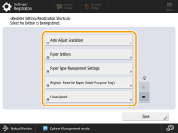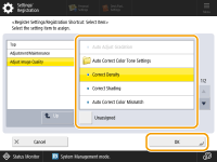 If <Settings/Regist. Shortcut> is not displayed on the <Home> screen, press   <Home Management Settings> <Restrict Function Display>   <Set> set <Settings/Regist. Shortcut> to be displayed.
