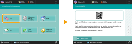 Appuyez sur <FAQ> pour afficher un code QR. Vous pouvez ensuite afficher la page FAQ de l’appareil en scannant le code QR sur un dispositif mobile tel qu’un smartphone ou une tablette.