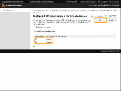 [Réglages Liste d'adr. personnelle/Liste d'adr. groupe d'utilisateurs], puis cochez la case [Appliquer la modification du nom du groupe d'utilisateurs au nom de la liste d'adresses du groupe d'utilisateur]. [Appliquer la modification du nom du groupe d'utilisateurs au nom de la liste d'adresses du groupe d'utilisateur] est disponible uniquement lorsque la gestion de l'authentification personnelle est activée.