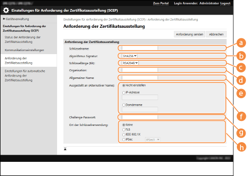 Sie können von einem SCEP-Server (Simple Certificate Enrollment Protocol), der Zertifikate verwaltet, die Ausstellung eines Zertifikats anfordern, das für die mit dem Gerät erzeugten Schlüssel erforderlich ist. Zertifikate vom SCEP-Server werden automatisch im Gerät registriert. Um die Ausstellung eines Zertifikats anzufordern, sind Administrator-Rechte erforderlich.