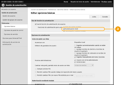 Si selecciona la casilla de verificación de la autenticación móvil, la casilla de verificación de la autenticación mediante teclado se seleccionará automáticamente. Asimismo, asegúrese de especificar las opciones de la autenticación mediante teclado.