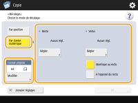 Si vous voulez déplacer l'image au dos quand vous copiez des deux côtés, vous devez spécifier le réglage <Verso>. Pour déplacer à la même position que le recto, appuyez sur <Identique au recto>. Pour déplacer symétriquement, appuyez sur <A l'opposé du recto>. Pour déplacer à une position différente du recto, appuyez sur <Régler> et saisissez la distance de déplacement.