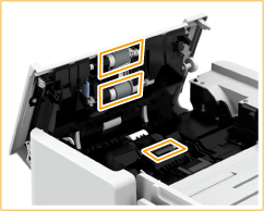 Assurez-vous qu'aucun corps étranger, comme des morceaux de papier, n'adhère au niveau des capteurs de détection d'alimentation de plusieurs feuilles (il a y deux capteurs). Si tel est le cas, retirez-les à l'aide d'un chiffon doux.