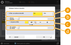 Appuyez sur <Oui> dans <Utiliser une adresse manuelle>, puis définissez les paramètres nécessaires.