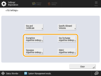 Se desejar usar uma chave e certificado gerado por você mesmo, gere a chave e o certificado antes de realizar o procedimento abaixo. Gerando a chave e o certificado para comunicação da rede Se desejar usar uma chave e certificado adquirido de uma autoridade de certificação (CA), registre a chave e o certificado antes de realizar o procedimento abaixo. Registando uma chave e um certificado Se configurar <Format Encryption Method to FIPS 140> como <On>, você poderá fazer com que o método de criptografia TLS da comunicação obedeça ao FIPS (Federal Information Processing Standards) 140 aprovado pelo governo dos Estados Unidos. <Format Encryption Method to FIPS 140> Se <Format Encryption Method to FIPS 140> estiver configurado como <On>, um erro ocorrerá quando você tentar especificar um certificado de TLS que use um algoritmo não reconhecido pelo FIPS (menor do que RSA2048bit). Um erro de comunicação ocorrerá se você configurar <Format Encryption Method to FIPS 140> como <On> e enviá-lo a um destino de terceiros que não suporte algoritmos de criptografia reconhecidos pelo FIPS. Se <Format Encryption Method to FIPS 140> estiver configurado como <On>, <CHACHA20- POLY1305> e <X25519> alternado para <Off>. Se <CHACHA20- POLY1305> ou <X25519> estiver configurado como <On>, <Format Encryption Method to FIPS 140> alterna para <Off>. |