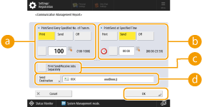Você não pode definir as configurações de relatório de gerenciamento de comunicações enquanto <Display Job Log> em <Management Settings> está configurado como <Off>. Além disso, se você alterar <Display Job Log> em <Management Settings> de <Off> para <On>, <Print/Send Every Specified No. of Transm.> e <Print/Send at Specified Time> no relatório de gerenciamento de comunicações automaticamente serão alterados para <Off>. <Display Job Log> |