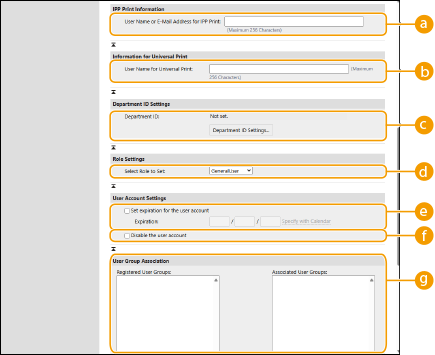 [IPP Print Settings] estiver ativada, você poderá definir o nome de usuário ou o endereço de e-mail usado para a impressão IPP para associar aos trabalhos de impressão IPP.