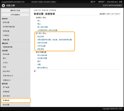 可以选择要导入或导出的特定设置,如“地址簿”中的地址列表,或打印机设置。必须具有管理员权限才能执行这些操作。