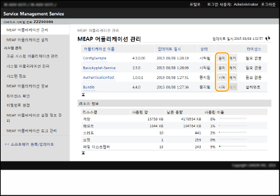 작동 상태 오른쪽에 있는 [시작] / [중지] 버튼을 클릭하면 MEAP 응용 프로그램 사용을 시작/중단할 수 있습니다.