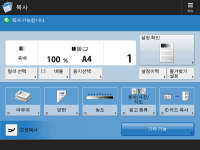 복사, 팩스, 스캔과 같은 기본 기능에 액세스할 수 있는 기본 기능 화면을 표시하려면 <홈> 화면에서 기능 버튼을 누릅니다. 기본 기능 화면의 표시 및 설정 항목은 기능에 따라 다르지만, 필요에 맞게 설정을 변경할 수 있습니다. 기본 특징 화면 사용자 정의하기